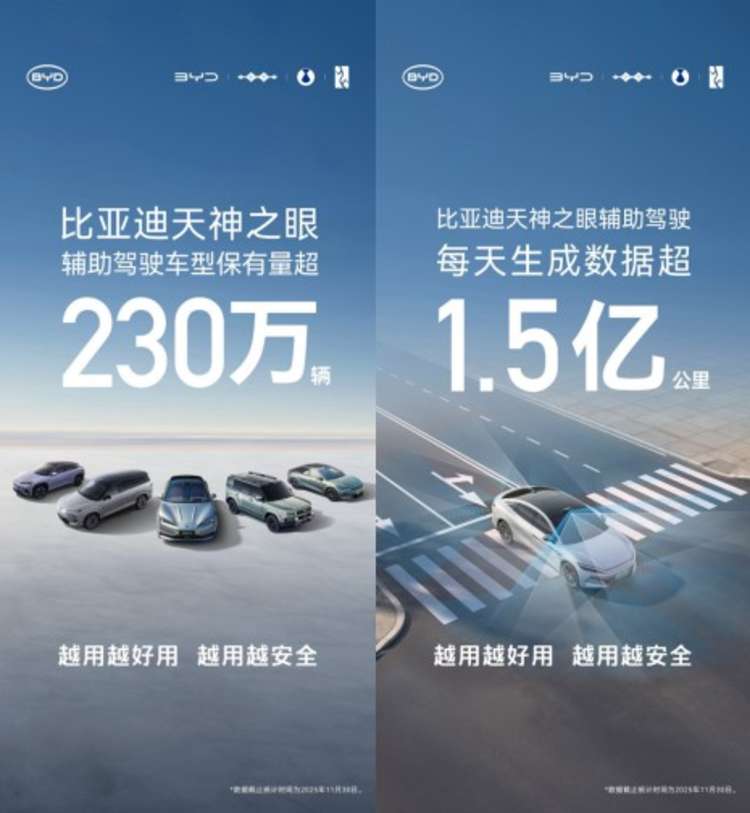 近日,比亞迪公布了其搭載天神之眼輔助駕駛系統(tǒng)的車型在11月的銷售數(shù)據(jù),全月銷量達311267輛,繼續(xù)引領市場。其中,比亞迪王朝與海洋系列貢獻265734輛,方程豹、騰勢、仰望等高端及個性化品牌亦表現(xiàn)穩(wěn)健,共同構筑了比亞迪在智能駕駛領域的強大產(chǎn)品矩陣。數(shù)據(jù)顯示,截至2025年11月底,比亞迪搭載“天神之眼”駕駛輔助系統(tǒng)的車型累計銷量已突破230萬輛,持續(xù)蟬聯(lián)中國輔助駕駛車型銷量及系統(tǒng)裝車量榜首。這標志著比亞迪推動的“全民智駕”戰(zhàn)略已取得顯著成效,智能駕駛正從高端配置加速向主流市場普及。龐大的用戶基盤帶來了海量的真實道路數(shù)據(jù)。據(jù)悉,比亞迪“天神之眼”系統(tǒng)每日生成的輔助駕駛數(shù)據(jù)已超過1.5億公里,海