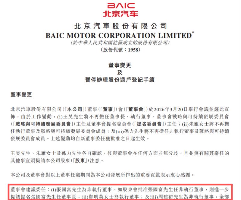3月20日,北京汽車(01958.HK)在港交所發(fā)布一則核心管理層調(diào)整公告。公告內(nèi)容顯示,由于工作變動王昊將不再擔任董事長、執(zhí)行董事及董事會戰(zhàn)略、提名委員會主任等職務。與此同時,建議委任北汽集團黨委常委、副總經(jīng)理張國富為非執(zhí)行董事,并擬提名其接任董事長。值得注意的是,從履新到卸任王昊“掌舵”北京汽車僅一年時間?;厮葜寥ツ?月13日,北京汽車發(fā)布公告,經(jīng)董事會會議審議決議,委任王昊為公司董事長。1982年出生的王昊,是北汽集團體系內(nèi)典型的少壯派代表,此番履新也讓他正式成為北京汽車的“當家人”。作為北京汽車首位“80后”掌舵人,王昊的到任一度被視作北汽推進管理層年輕化、加速轉(zhuǎn)型的重要信號。在其任期
