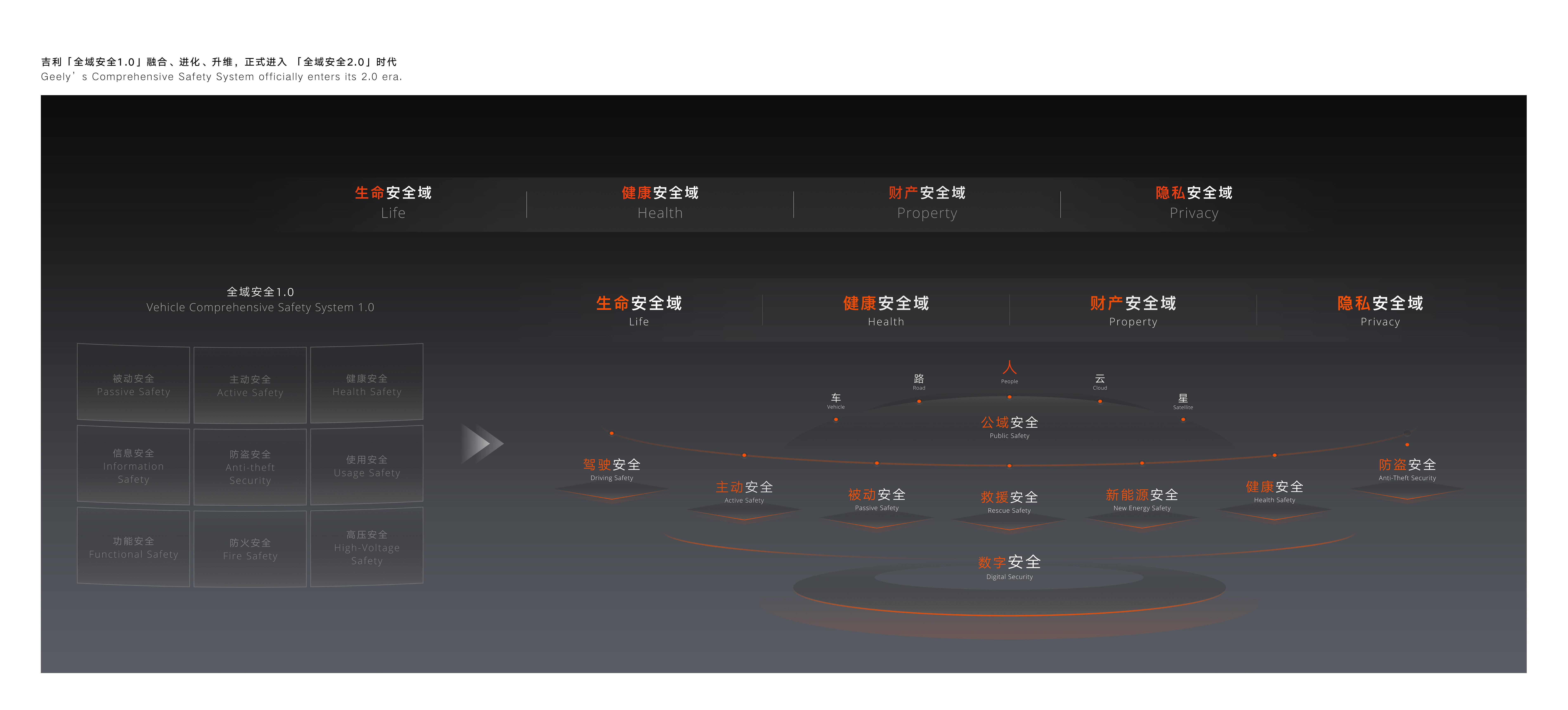 作為行業(yè)安全技術(shù)的先行者與引領(lǐng)者,吉利在“全域AI”技術(shù)體系的賦能下,以“AI為綱 責(zé)任為本”,基于原有的“全域安全”技術(shù)體系進(jìn)階打造“全域安全2.0”技術(shù)體系。結(jié)合智能時(shí)代的安全新需求和新挑戰(zhàn),“全域安全2.0”技術(shù)體系秉持“以人為尊”理念,通過技術(shù)升級(jí)、能力突破與范式創(chuàng)新,將側(cè)重“整車安全”的視角升級(jí)為“人-車-路-云-星”的生態(tài)視角,旨在貫穿用戶出行全場(chǎng)景、覆蓋出行全領(lǐng)域、聯(lián)動(dòng)出行全生態(tài);并以“生命零傷亡、健康零危害、財(cái)產(chǎn)零損失、隱私零泄露”四大安全愿景為指引,逐步構(gòu)建的一套為消費(fèi)者提供全面的安全保障技術(shù)體系。