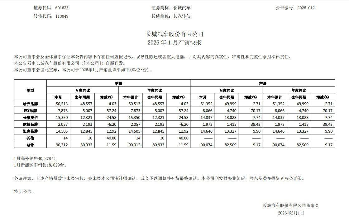 長城汽車1月銷量為90,312輛,同比增長11.59%,延續(xù)2025年穩(wěn)定增長態(tài)勢。1月海外銷量為40,278輛,同比增長43.8%。扣除海外銷量,長城汽車國內(nèi)銷量下滑。哈弗品牌依然是銷量“壓艙石”,銷量占比55.9%。WEY品牌在MPV+SUV的驅(qū)動下,同比增長57.24%。2026年,歐拉品牌能否重回增長通道,或?qū)Q定長城汽車能否再進一步。