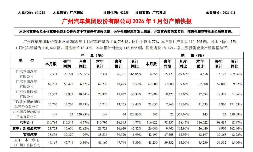 廣汽集團1月銷量達116,622輛,同比增長18.47%。對廣汽來說,這是一份鼓舞人心的“開門紅”。其中,新能源車銷量為26,040輛,同比增長162.9%,該增長受埃安銷量暴增刺激,1月埃安銷量達21,635輛,同比增長171.63%。廣汽傳祺表現(xiàn)也亮眼,同比增長51.06%。廣汽豐田是廣汽的銷量“壓艙石”,銷量占比53.7%。而受芯片短缺停產(chǎn)影響,廣本月銷量不足5000輛,下滑明顯。