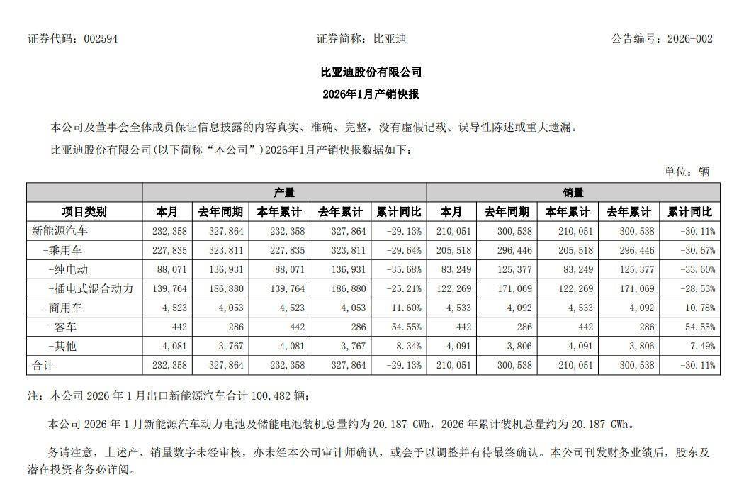 比亞迪1月銷量為210,051輛,同比下滑30.11%,丟掉“中國第一”,位列第三。其中,比亞迪出口銷量為100,482輛,同比大幅增長51.6%。若扣除出口銷量,比亞迪國內(nèi)1月銷量同比下滑53.2%。出口已成為比亞迪的新增長極,受益于在海外市場布局的逐步落地,其出口表現(xiàn)值得期待。