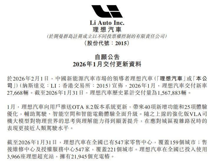 理想汽車1月交付量為27,668輛,同比下滑7.5%,較2025年全年18.8%的同比降幅有所收窄。在增程市場面臨的競爭壓力加大,是理想汽車進入下降通道的主因。進入2026年,理想汽車的看點在于能否通過具身智能增加新競爭力和吸引力。