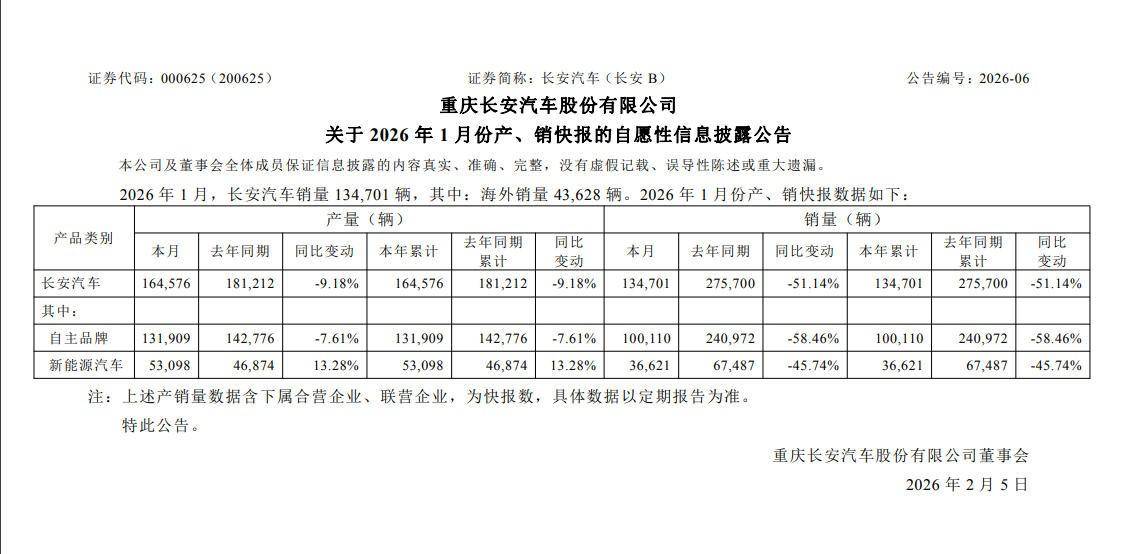 長安汽車1月銷量為134,701輛,同比下滑51.14%。其中,自主品牌銷量達100,110輛,同比下滑58.46%,占比較同期下降13.1個百分點,表明自主品牌1月銷量下滑幅度更大。另外,新能源車銷量達36,621輛,同比下滑45.74%。燃油車月銷量近10萬輛,成為長安汽車銷量“壓艙石”,CS75系列、逸動系列表現(xiàn)突出。