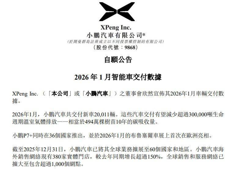 小鵬汽車1月交付量為20,011輛,同比下滑34.1%,與2025年全年126%的高增長形成鮮明對比,表明增長承壓。AI 新豪華大六座旗艦 SUV——小鵬 GX,是小鵬汽車2026年的新看點——能否重新提升小鵬品牌。