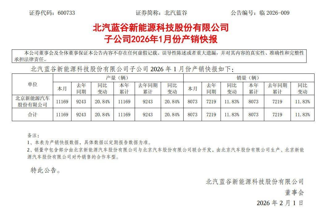 北汽藍(lán)谷1月銷量為8073輛,同比增長11.83%,表現(xiàn)較好。2025年極狐全年銷量超16萬輛,同比增長99%,尊界銷量也有增長。2026年北汽藍(lán)谷看點:極狐能否繼續(xù)通過新品攻勢以價取勝、尊界能否借勢加快獲取增量。