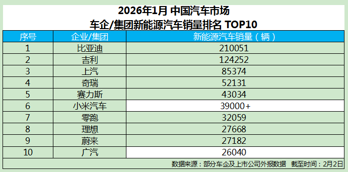 2026年1月新能源汽車銷量冠軍揭曉,比亞迪繼續(xù)領(lǐng)跑