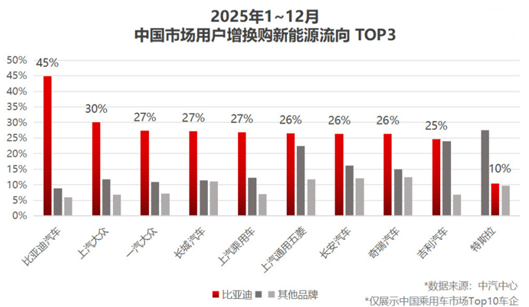 行業(yè)正從“得新客者得天下”轉(zhuǎn)向“留老客者定江山”的新階段。數(shù)據(jù)顯示,在國(guó)內(nèi)乘用車(chē)市場(chǎng)TOP 10車(chē)企用戶(hù)中,平均每4個(gè)增換購(gòu)新能源的用戶(hù)里,就有1個(gè)選擇了比亞迪。