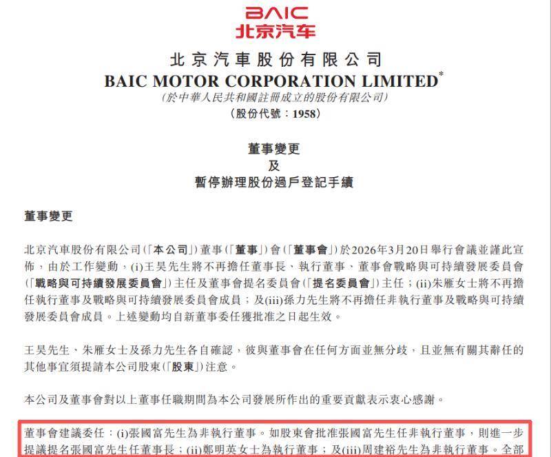 3月20日,北京汽車(01958.HK)在港交所發(fā)布一則核心管理層調(diào)整公告。公告內(nèi)容顯示,由于工作變動王昊將不再擔(dān)任董事長、執(zhí)行董事及董事會戰(zhàn)略、提名委員會主任等職務(wù)。與此同時,建議委任北汽集團(tuán)黨委常委、副總經(jīng)理張國富為非執(zhí)行董事,并擬提名其接任董事長。